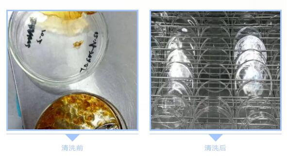 培養皿經實驗室洗瓶機清洗后,難以清除的霉斑和標記號全部清除。透明潔凈,光亮如新,清洗效果一目了然。