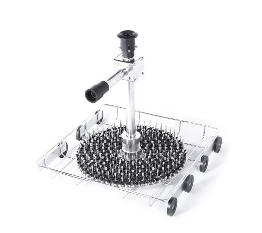 洗瓶機定制專用籃架ID016系列主要用于清洗50-1500ml的進樣瓶、頂空瓶、離心管、小試管、小試劑瓶等細小瓶。噴針細以≤3mm為主,分布在大圓盤的分流盤面上,可根據不同高度的瓶子設計相應長度的噴針。