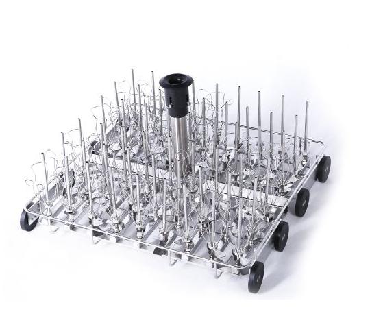 實驗室洗瓶機定制專用籃架ID038系列配有花形瓶托,主要以放置容量瓶、錐形瓶、試劑瓶為主。噴針呈平行均勻分布,可根據瓶子的大小設計不同的噴針間距和數量,適合于集中清洗50-1500ml同一規格的瓶子。
